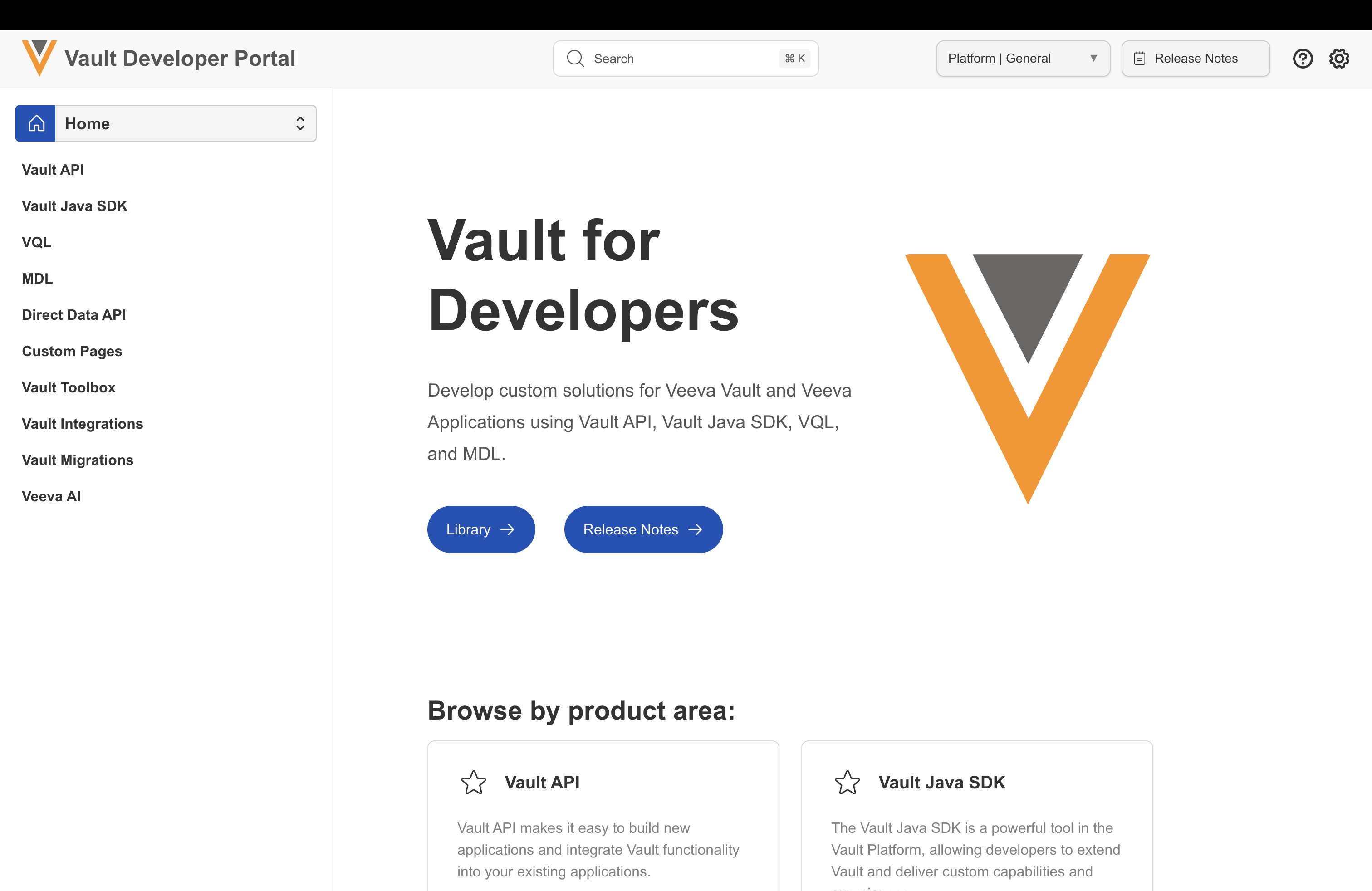 In 26R1, we are launching our new Vault Developer Portal: veevavault.dev. This new website includes in-depth documentation for building custom solutions with Vault API, Vault Java SDK, VQL, and MDL. Developers can use advanced search to find technical references, user guides, and developer release notes. The legacy portal will continue to be available during the transition.