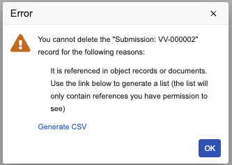 This feature enhances the process of deleting master data, such as Process Steps, Hazards, and so on. In Vaults with HACCP Plan Translation enabled, when a user deletes a master data record, Vault deletes the corresponding child translation records. Previously, users could bulk delete up to 26 master data records with 500 associated translation records at once if all 19 supported languages were active in their Vault. With this enhancement, users can bulk delete batches of up to 394 master data records and 7,500 associated child translation records in a single transaction.